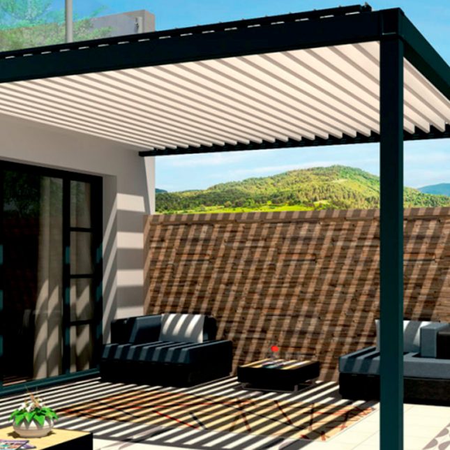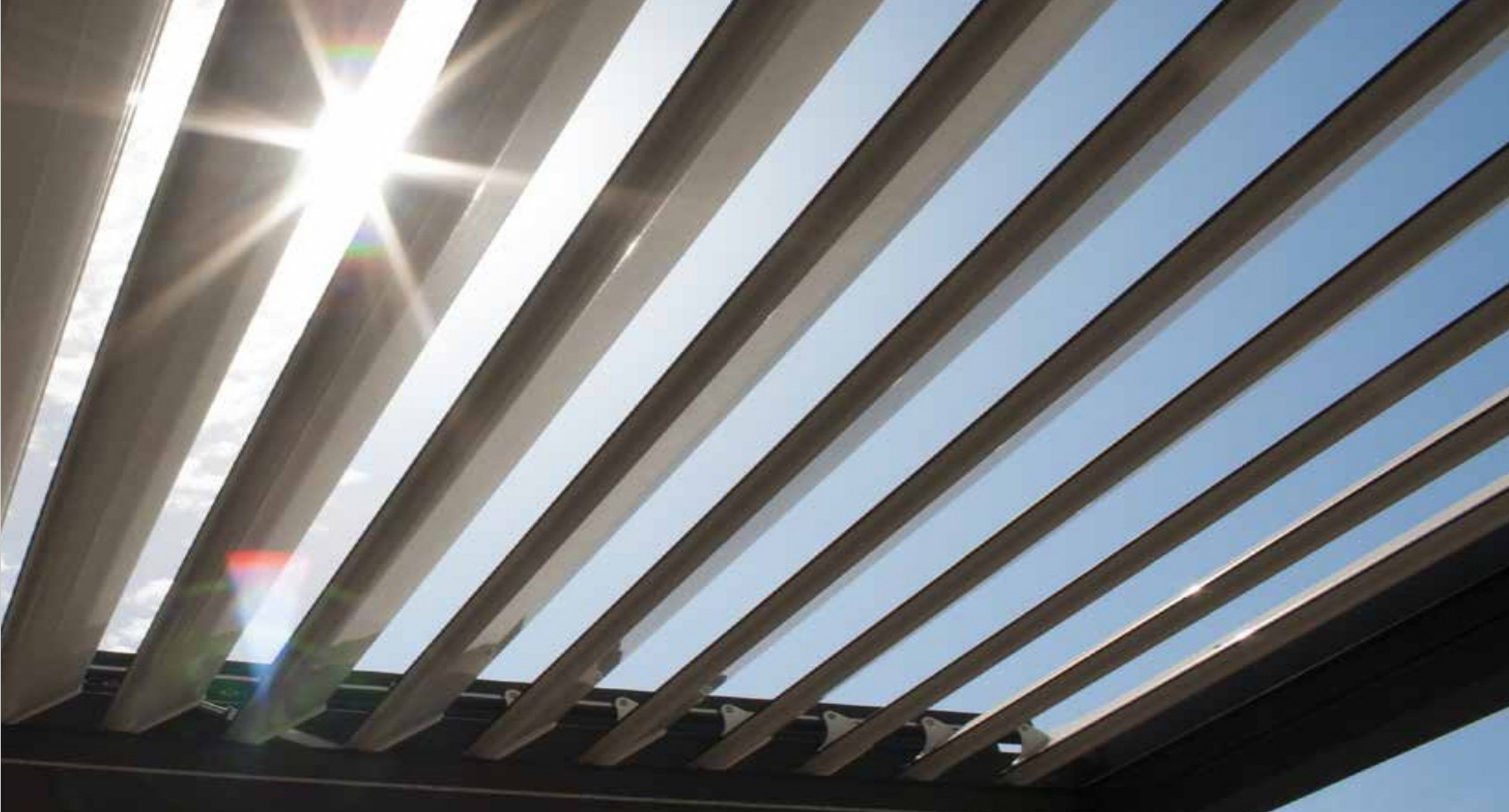 El usuario de la Pérgola tiene control total sobre las lamas. Con un mando a distancia, es posible ajustar la orientación de las lamas en un rango de 0º a 145º.